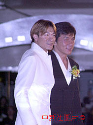 成龍十六日晚與劉德華一齊步入星光大道,出席第十九屆香港電影金像獎頒獎晚會。中新社傳真洪少葵攝