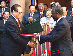 江澤民主席與南非總統(tǒng)姆貝基于二十五日共同簽署關于兩國伙伴關系的比勒陀利亞宣言。中新社記者 彭偉祥 攝