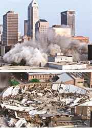 圖文:“貓王”告別演唱會(huì)場館爆炸拆卸 2001年07月10日 15:23 ![]() 體育館在數(shù)秒內(nèi)變?yōu)轭j垣敗瓦 中新網(wǎng)紐約7月9日消息:“貓王”埃爾維斯·普萊斯利生前舉行最后一場演唱會(huì)的“市場廣場體育館”,當(dāng)?shù)貢r(shí)間8日在八響爆炸聲中被炸毀拆卸。 這座位于美國印第安納波利斯的體育館,當(dāng)年共耗資2400萬美元興建,而在周日早上的拆卸工程中,逾600磅的黃色炸藥將之在短短12秒內(nèi)便變?yōu)橐黄j垣敗瓦。 這座體育館也是美國職業(yè)籃球隊(duì)印第安納步行者隊(duì)從1974至1999年間的舊主場,而場館的最后一次活動(dòng)正是步行者隊(duì)在1999年10月?lián)魯—q他爵士隊(duì)的一場比賽。 至于當(dāng)年“貓王”的最后一場表演,亦是于1977年6月在這里舉行。 |
