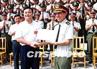 圖:珠海慰問駐澳部隊官兵 2001年07月27日 20:39 ![]() 七月二十七日,珠海市委市政府慰問團到駐澳門部隊珠;匚繂,珠海市副市長郭開華(左)代表珠海市向駐澳門部隊珠;刭浰臀繂柦。中新社圖 石頭 攝