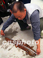 圖:為娃娃魚尋找放生地 2001年10月05日 10:35 ![]() 由于黑河引水工程,陜西省周至縣黑河大橋下游淺灘近日頻頻發(fā)現(xiàn)娃娃魚,大橋收費站的工作人員出于對珍稀動物的保護,準備將這條重三公斤、身長七十五厘米的娃娃魚尋找放生地,以保護這一地區(qū)的生態(tài)平衡。中新社圖 尚鴻珠 攝 |