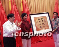 圖:李勁祥向宋氏祖居基金會(huì)贈(zèng)送蔣緯國先生手書復(fù)制件 2001年10月18日 22:15 ![]() 歐美同學(xué)會(huì)副會(huì)長、全球華人反獨(dú)促統(tǒng)聯(lián)盟副會(huì)長李勁祥先生(左一)18日在贈(zèng)送把一九九三年蔣緯國先生親贈(zèng)與他的“和平統(tǒng)一、振興中華”的手書復(fù)制件贈(zèng)送海南向宋氏祖居基金會(huì)。中新社圖 王辛莉 攝 |