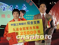 廣東肇慶四會籍選手冼東妹(左)在九運會上奪得五十二公斤級柔道冠軍,肇慶四會市特別獎勵她25000元人民幣。圖為市委書記龍紅輝八日親手把現(xiàn)金支票送到冼東妹手中。中新社圖 黃耀輝 攝