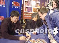 ![]() 今天中午,達(dá)拉斯小牛隊(duì)的高大中鋒王治郅出現(xiàn)在紐約市中心NBA專賣店里。他是第一個(gè)被美國職業(yè)籃球隊(duì)選中的中國球員。為表彰他的卓越才華和對籃球運(yùn)動的貢獻(xiàn),一套以他個(gè)人肖像為主題的法定郵票今天開始公開發(fā)售。中新社記者 陳建 攝
