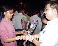 圖:海南元宵換花節(jié) 青年當街互換花 2002年02月27日 10:48 ![]() 元宵佳節(jié),海南省瓊山市舉辦民間元宵換花節(jié),近十萬市民參與了當晚的賞燈換花活動。圖為一對男女青年當街相互換花,有情人以此連理。中新社圖 王辛莉 攝