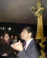 三星堆青銅器亮相紐約大都會博物館(多圖) 2002年03月06日 10:06 ![]() 鑲有金箔的青銅頭像是四川三星堆出土、公元前十三世紀(jì)的珍貴文物。 ![]() 紐約大都會博物館亞洲部副主任孫志新博士,向人們解說首次在美國亮相的中國四川三星堆青銅器的特點。 中新社紐約三月四日電(記者 陳建)天藍(lán)色的廣告旗幟今天懸掛在紐約大都會博物館正門外,告訴人們展現(xiàn)中國古蜀文化的珍寶將于三月六日至六月十六日在這里展出。這些展品中最令人驚嘆的,莫過于從四川三星堆出土、約三千年前的青銅器。 走進一樓展廳,最先看到的是一尊寬一米三八、高六十六厘米的U型青銅面具。沒有溫柔的背景光源,只有幾束強光從不同角度打在線條粗獷的面具上,留下明顯的陰影。面具形象與傳統(tǒng)的中國人差異很大——粗眉、大眼、高鼻、闊嘴,眼珠的位置上還釘著楔子!面具后,是一面高大的黑色背景板,上面用淺灰色的字寫著:“寶藏源自一個消失的文明”。 這就是從四川中部三星堆遺址中出土的青銅器,鑄造年代大約是公元前十三世紀(jì),比中原地區(qū)的青銅器普遍早幾百年。那時,地球上的絕大部分地區(qū)還處于蠻荒時代。迄今,全世界的專家都弄不清楚,三星堆青銅器高超的冶煉技術(shù)是從哪兒來的?古蜀國是怎么產(chǎn)生、持續(xù)多久、為什么又突然消亡了? 不過,古蜀文明雖然看上去有暴戾、兇悍和屬于靈鬼的一面,但展品中,人們也能找到許多纖美、甚至世俗的特征。一棵青銅鑄造、攀龍附鳳、綴滿銅錢的“發(fā)財樹”就精美得幾近繁瑣。另外一尊全高兩米六、細(xì)細(xì)長長的青銅人像,雖然也是粗眉、大眼、高鼻、闊嘴、兩支大耳朵上明顯地穿了能帶耳環(huán)的“耳洞”,但面目祥和許多,眼睛上也沒釘楔子。 據(jù)說,那尊青銅人像是世界上現(xiàn)存最高的青銅像。銅像兩手一高一低,好像握著什么東西。專家推測,因為太細(xì)太高,銅像站在那里,如果手中再稍有負(fù)重,肯定會摔倒。 本次四川古代藝術(shù)展共有一百二十八件文物,除青銅器外,還有玉雕、石雕等。 據(jù)紐約大都會博物館亞洲部副主任孫志新博士介紹,本次展覽是近年來唯一一次展示四川一個地方從公元前十三世紀(jì)到公元三世紀(jì)約一千五百年間的文化源流與演變,對于向世人集中介紹中國文化的起源、中國古代文明的形象具有非常重要的意義。 據(jù)悉,在紐約展完后,這些珍貴文物還將到多倫多展出四個月。