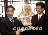 圖文:臺(tái)北孔廟訪問團(tuán)一行三十六人來滬交流 2002年03月20日 06:03 ![]() 前來參加此間滬臺(tái)兩地“佾舞文化交流”活動(dòng)的臺(tái)北市“民政局長”林正修,今日上午參觀了上海文廟。圖為林正修(圖左)在參觀中。中新社圖 湯彥俊 攝