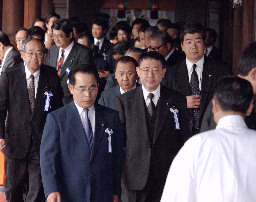 繼小泉后日本88名國(guó)會(huì)議員集體參拜靖國(guó)神社(圖) 2002年04月23日 10:26 ![]() 日本國(guó)會(huì)議員集體參拜 中右為自民黨干事長(zhǎng)山崎拓 中新網(wǎng)北京4月23日消息:由日本保守派議員組成的“大家都來(lái)參拜靖國(guó)神社國(guó)會(huì)議員會(huì)”的成員今天上午集體參拜了靖國(guó)神社。 據(jù)共同社報(bào)道,自民黨干事長(zhǎng)山崎拓、保守黨干事長(zhǎng)二階俊博和民主黨的小林憲司等88名參眾兩院議員,91名國(guó)會(huì)議員的代理人以及國(guó)家公安委員長(zhǎng)村井仁參加了靖國(guó)參拜。 日本首相小泉純一郎21日上午突然參拜了靖國(guó)神社,引起中國(guó)和韓國(guó)政府的強(qiáng)烈不滿和抗議。 位于東京九段北的靖國(guó)神社內(nèi)供奉著日本明治維新以來(lái)歷次對(duì)外戰(zhàn)爭(zhēng)中246萬(wàn)多戰(zhàn)死者的牌位,其中包括東條英機(jī)等甲級(jí)戰(zhàn)犯。