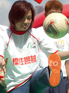 圖:容祖兒參加迎接世界杯活動 2002年05月05日 17:51 ![]() 香港歌星容祖兒,5月4日參加在青衣運動場舉行的“香港青少年迎接世界杯活動”竭盡全力表演足球基本功。任晨鳴攝