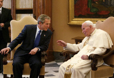 圖:布什會見羅馬教皇 討論天主教性丑聞事件 2002年05月29日 11:21 美國總統(tǒng)布什在梵蒂岡與羅馬教皇約翰·保羅二世舉行短暫會晤。會晤中談及有關(guān)中東危機(jī)和美國羅馬天主教性丑聞等問題。法新供中新