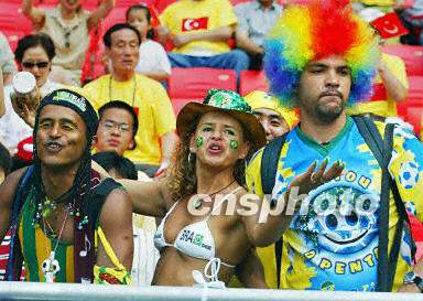 圖:女球迷身穿比基尼觀看巴西與土耳其比賽 2002年06月03日 17:12 6月3日下午,韓日世界杯C組巴西與土耳其隊的比賽正在韓國蔚山文竹體育場進行。圖為看臺上身穿比基尼的女球迷。