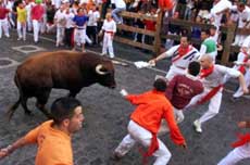 圖:西班牙奔牛節(jié)造成多人受傷 2002年07月08日 19:59 ![]() 7月6日,一年一度的奔牛節(jié)在西班牙潘普洛納市拉開帷幕;顒赢(dāng)天,就有數(shù)人在斗牛狂奔過程中被牛角刮傷。據(jù)稱,今年的奔牛節(jié)是近年來最危險(xiǎn)的一次。圖為奔跑的人們引領(lǐng)著瘋狂的公牛。(春風(fēng))