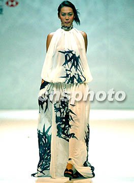 圖:港時(shí)裝節(jié)展示鄧達(dá)智的“水墨畫”女裙 2002年07月12日 10:11 ![]() “2003香港春夏時(shí)裝節(jié)”7月10日晚舉行香港十位頂尖設(shè)計(jì)師作品展示,模特身著設(shè)計(jì)師鄧達(dá)智的一件上繪墨竹全白透明沙裙款款款而行,宛如一幅流動(dòng)的中國(guó)水墨國(guó)畫。任晨鳴 攝