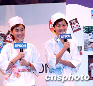 圖:香港偶像組合Twins推介打印機 2002年07月16日 18:43 ![]() 香港偶像組合Twins雙生兒蔡卓妍及鍾欣桐,7月16日打扮成為日本壽司師父出席EPSON新型彩色噴墨打印機推介會,介紹Twins寫真珍藏集打印的照片。中新社傳真 洪少葵 攝
