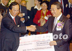 ![]() "中銀香港(控股)有限公司"7月25日成功在香港上市掛牌后,中國銀行副董事長,中銀香港(控股)有限公司、中國銀行(香港)有限公司副董事長及總裁劉金寶(右)向香港公益金籌款委員會(huì)主席柯清輝贈(zèng)送一百萬港元支票。任晨鳴 攝