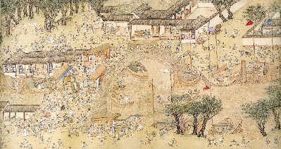 仇英的《清明上河圖》比宋本要長(zhǎng)一倍,達(dá)到9.87米,以明代蘇州城為背景,采用青綠重設(shè)色方式,畫(huà)中人物超過(guò)2000位,描繪明代江南社會(huì)的城鄉(xiāng)人民生活實(shí)景,表現(xiàn)了熱鬧紛擾的市井生活和民俗風(fēng)情,場(chǎng)面宏大,氣勢(shì)雄偉。唐末孫位的《高逸圖》(又名《竹林七賢圖》)中的畫(huà)名“孫位高逸圖”為宋徽宗趙佶所題,它所描繪的是魏晉時(shí)期膾炙人口的竹林七賢的故事。畫(huà)家通過(guò)嫻熟高超的技術(shù),出色刻畫(huà)了魏晉士大夫的精神氣質(zhì)。