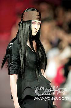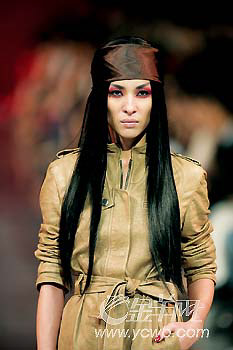 Dior2006-2007秋冬秀場的模特讓人印象深刻的,除了設(shè)計夸張的墨鏡外,人人都有一頭如旗幟般飄逸柔順的長直發(fā),統(tǒng)統(tǒng)包裹在紫褐色頭巾下,很有上世紀(jì)80年代的懷舊感。但更重要的是,每件衣服都暗含硬朗的符號,就像模特們脫掉墨鏡之后,露出詭異的紅色眼妝一樣,她們似乎都在堅定地走不妥協(xié)路線。