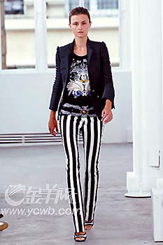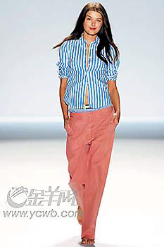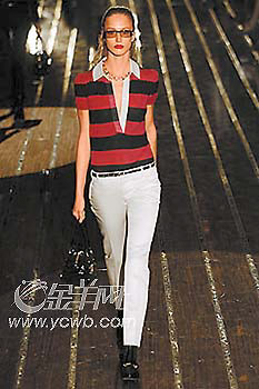 在Gucci今季以揚(yáng)帆出海為主題的日間裝扮中,可以見到一條簡潔清爽的白色鉛筆褲貫穿始終,上身的海軍藍(lán)、白色及紅色條紋T恤,則用性感的低V設(shè)計(jì)來吸引人,腰帶細(xì)得若有若無,腳上是耀眼的金色高跟鱷魚皮鞋,既給人較中性化的感覺,又不失女性的韻味。要帥又要不失性感,實(shí)際上,這就是新帥男孩的最佳尺度。
