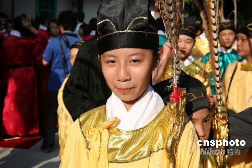 十月五日舉行的臺北祭孔大典上,大龍小學(xué)的佾生伴著樂曲起舞,要完成九十六個舞蹈動作,佾生們要練一年以上并寫出動作記錄才能記住,因此被戲稱為大龍小學(xué)的“秘笈”。圖為可愛的小佾生。中新社發(fā) 楊旭 攝