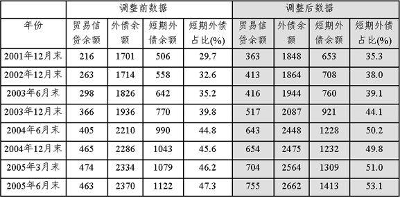 2001-2005年6月末貿(mào)易信貸統(tǒng)計(jì)方法調(diào)整前后外債有關(guān)指標(biāo)對(duì)比