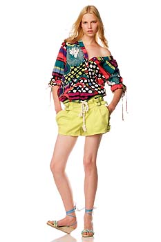 Kookai模特將寬松Tee的一側(cè)肩頭隨意扯下,橫的條紋被拉出傾斜效果,加上不修邊幅的拉扯感,仿佛由淑女變成了熱情奔放的嘻哈女孩,帥氣的寬褲腿以及可愛的蓬蓬裙都能襯得起這樣的不羈。ARMANIJEANS更加勇敢,將寬松的低胸花襯衫一側(cè)拉低,與鮮艷的小短褲一同制造最動人的單膊look。當(dāng)然,這樣做的首要一條是做足保險(xiǎn),千萬別以走光作代價。