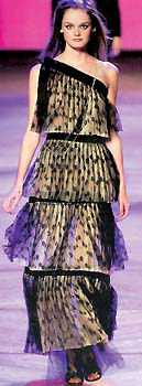 今季時裝界空前重視柔美因素,浪漫的蝴蝶結(jié)、蕾絲與荷葉邊極速上位,不甘寂寞的設(shè)計(jì)師們在單膊設(shè)計(jì)的幾何裁邊兒上方綴以大面積的蕾絲或荷葉邊,如此一來,高貴與可愛之氣油然而生,產(chǎn)生了一種類似于公主禮服般的效果。