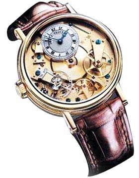 這款精美腕表的革命性設(shè)計(jì)在于,橋架、齒輪、擒縱機(jī)構(gòu)、發(fā)條盒和零件均一目了然,而通常這些零件都是安裝在底板之下的,表的觀賞性得到巨大地提高。這是一款將超現(xiàn)代理念和傳統(tǒng)完美結(jié)合的表款:一絲不茍的規(guī)范,躍然眼前的擺輪在勻稱的橋架支撐下運(yùn)轉(zhuǎn)有致,且因精美的裝飾而更加奪目。橋架和底板為噴砂處理,其所采用的修整技術(shù)需要非同一般的技巧,才能使之均衡平整,堅(jiān)固耐用。這款精品體現(xiàn)了獨(dú)特的風(fēng)格和全新的技藝,表明寶璣表在與時(shí)俱進(jìn)的同時(shí),不失其一如既往的純正和優(yōu)雅,絕不會(huì)偏離品牌的身份與本質(zhì)。