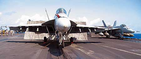 美軍飛機(jī)從航母上起飛時(shí),并不是“飛”出去,而是被一個(gè)類似于大力彈簧的彈射器“彈”出去的。同樣,飛回航母的飛機(jī)也不是“!毕聛淼模潜蝗鹱钄r作用的鋼索“絆”住的。三根設(shè)在前、中、后位置的阻攔索,就是飛行員降落的三次機(jī)會(huì)。飛行員根據(jù)飛機(jī)快要著陸時(shí)的高度,來決定把飛機(jī)掛在哪一根阻攔索上!袄锔碧(hào)每隔45秒可以降落一架飛機(jī),降落時(shí)速度在兩秒鐘內(nèi)從105英里每小時(shí)降到0,可謂嘎然而止。半個(gè)多小時(shí)的觀摩中,我們觀看了十幾個(gè)架次飛機(jī)的起降,其中只有一次失敗——一架F-18戰(zhàn)斗機(jī)降落時(shí)沒能成功掛住阻攔索,因此不得不重新飛上天空。