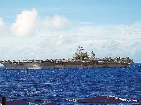 中國(guó)觀摩團(tuán)訪問的是美軍“里根”號(hào)核動(dòng)力航母,這是美軍最大、最新的一艘航空母艦。站在長(zhǎng)333米、寬41米的甲板上,絲毫感覺不到航母的移動(dòng)。甲板下大大小小上千個(gè)房間,讓人眼花繚亂。據(jù)介紹,來這里的新兵第一個(gè)星期沒有人能夠找到正確的路,雖然每層有路標(biāo)和地圖。