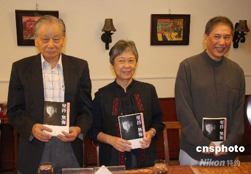 九月三十日下午,女作家陳若曦(中)在臺(tái)北舉辦新著《堅(jiān)持·無悔——陳若曦七十自述》出版發(fā)布會(huì)。著名作家白先勇(右)前來向當(dāng)年臺(tái)大老同學(xué)祝賀。陳若曦一九三八年生于臺(tái)北縣中和,臺(tái)大外文系畢業(yè)后留學(xué)美國,獲約翰霍普金斯大學(xué)寫作系碩士。一九六六年與丈夫回到中國大陸,一九七三年到香港居住,先后移居加拿大、美國,近年定居臺(tái)北。其作品曾被譯為英、德、日、法、挪威等文字。中新社發(fā) 耿軍 攝