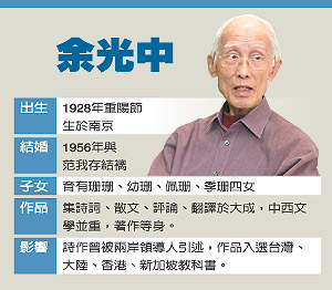 余家上上下下、里里外外,都范我存打理;余光中管理的,唯有一大方書案,與車子的方向盤。詩(shī)人不挑食、不挑衣,“太太弄什么,便吃什么;給什么,就穿什么!”