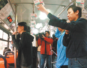 周美青上車時,媒體跟著蜂擁上車,公交車司機(jī)嚇了一大跳,嘴巴張得開開的合不攏。上車時沒座位,周美青站著,像一般上班族戴上mp3聽音樂;到快下車前,才有個空位坐下。