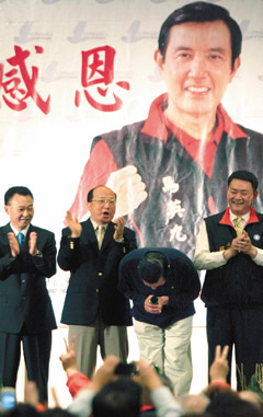 據(jù)臺(tái)灣《聯(lián)合報(bào)》報(bào)道,馬英九26日到臺(tái)中縣市、苗栗、桃園等地謝票,民眾搶著和他握手,捉住機(jī)會(huì)就和“馬總統(tǒng)”合照。馬蕭在北、中臺(tái)灣大贏對(duì)手,馬英九夸支持者“很厲害”、“贏得太過(guò)分了!”向民眾鞠躬十秒鐘。