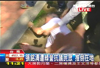 2008年10月21日,大陸海協(xié)副會(huì)長(zhǎng)張銘清在臺(tái)進(jìn)行學(xué)術(shù)交流到臺(tái)南市參觀時(shí),被極端分子推倒在地;當(dāng)張銘清準(zhǔn)備乘車離開時(shí),有人甚至跳上張銘清座車車頂狂踩,試圖阻止張銘清離開。