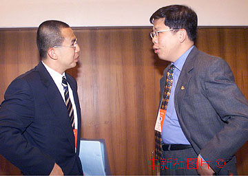 盈科拓展集團主席兼行政總裁李澤楷(左)15日在北京舉辦的“21世紀論壇”2000年會議上,與新浪網總裁兼首席執(zhí)行官王志東交談。中新社記者 李剛 攝