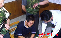 重慶警方9月19日晚21時50分在重慶渝中區(qū)觀音巖捕獲渝、湘、鄂系列槍支搶劫案首犯張君。圖為張君被捕獲后接受警方審問。作者:石智勇