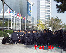 為使第三屆亞歐會(huì)議順利召開,韓國出動(dòng)了將近三萬名警察。這是會(huì)場外的防暴警察在待命。中新社記者:王曉暉 攝