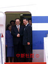 首次進京述職的澳門特別行政長官何厚鏵陪同國家主席江澤民乘專機19日抵達澳門。中新社傳真 滿會喬攝