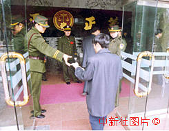 原江西省副省長胡長清一案十五日在南昌市公開宣判,審判庭約千余旁聽席坐無虛席。圖為南昌市中級人民法院的法警在第二道入場的關卡處驗票。中新社記者 段八一 攝