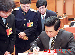 胡錦濤為人大代表們?cè)谑兹辗馍虾炞?br/> 2000年3月12日 09:35 ![]()