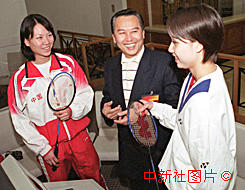全國(guó)人大廣東代表、羽毛球國(guó)家級(jí)教練傅漢洵(中)十二日在住處熱忱接待他的兩個(gè)得意門(mén)生、中國(guó)羽毛球隊(duì)運(yùn)動(dòng)員謝杏芳和張潔雯,并對(duì)她們傳授球藝。傅漢洵是世界羽毛球雙打冠軍關(guān)渭貞、吳迪西、林雁芳、勞玉晶的教練。作者:陳勇