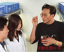 全國(guó)人大代表,北京大學(xué)副校長(zhǎng)陳章良教授(右一)十三日在實(shí)驗(yàn)室與科研人員開(kāi)展人類第一次破譯全部DNA密碼的高等植物擬南芥的研究。作者:陳勇