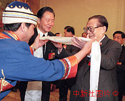 國家主席江澤民十三日到全國人大甘肅省代表團(tuán)參加討論時,接受少數(shù)民族獻(xiàn)上的哈達(dá)。作者:宗金柱