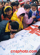 河南鄭州近萬(wàn)名中小學(xué)生簽名拒絕邪教 2001年2月9日 10:31 ![]() 河南省會(huì)鄭州萬(wàn)余名青少年和各界群眾聚集火車(chē)站廣場(chǎng),舉行“崇尚科學(xué)、反對(duì)邪教”簽名活動(dòng),同時(shí)鄭州市青年志愿者反邪教宣傳隊(duì)宣告成立。中新社圖 慎重 攝 |