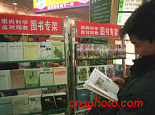以“反對邪教、維護穩(wěn)定、崇尚科學、傳播文明”為主題的“青年文明社區(qū)反邪教行動”近日在北京市全面啟動。北京圖書大廈特設“反邪教”圖書專柜,一位年青人認真翻閱宣傳圖書。中新社圖 陸云 攝