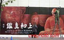 中國(guó)唐代高僧鑒真東渡日本,帶來大量中國(guó)先進(jìn)文化,成為中日友好交流的象征。時(shí)隔一千多年,鑒真至今仍深受日本人民尊敬,東京美術(shù)館今春舉辦為期兩個(gè)月的“鑒真和尚展”。圖為兩名工作人員在東京鬧市區(qū)涉谷描繪巨幅展覽廣告畫。中新社圖 陶光雄 攝