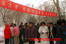 近日山東大學(xué)師生冒著嚴寒在校園舉行“校園拒絕邪教”萬人簽名活動。中新社傳真 荊強攝