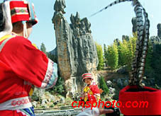 春天到云南石林旅游的游客,穿上彝族服裝在阿詩瑪形象石前拍攝美好的瞬間。中新社記者 滿會喬 攝