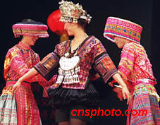 中國新絲路模特赴德國表演團(tuán),二十二日在北京嘉里中心飯店舉行專場展示。圖為模特展示中國歷代少數(shù)民族服飾作品。中新社圖 東方 攝