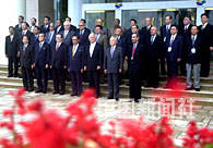 中國國家主席江澤民二十六日在海南博鰲水城集體會(huì)見出席亞洲論壇的貴賓,并在鮮艷的紅花叢前,與這些亞洲國家的前政要們和論壇秘書長合影。中新社記者 賈國榮 攝